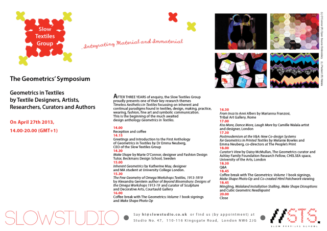We’re delighted to announce that Alexandra Gerstein, curator of Sculpture and Decorative Arts at the Courtauld Gallery, London, is presenting an exclusive paper to the Slow Textiles Group on 27th April 2013. As curator of Beyond Bloomsbury: Designs of the Omega Workshops 1913 – 19, one of her specialisms is the Omega Workshops, twentieth century textiles and the artist’s relationship with design and commerce. Her paper, THE FREE GEOMETRY OF OMEGA WORKSHOPS TEXTILES 1913-1919, starts at 3.30pm.