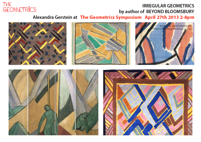 Among many wonderful and inspiring papers being presented on Saturday 27th April 2013 from 2-8pm at The Geometrics Exhibition & Symposium is Alexandra Gerstein’s paper The Free Geometry of Omega Workshops Textiles, 1913-1919.