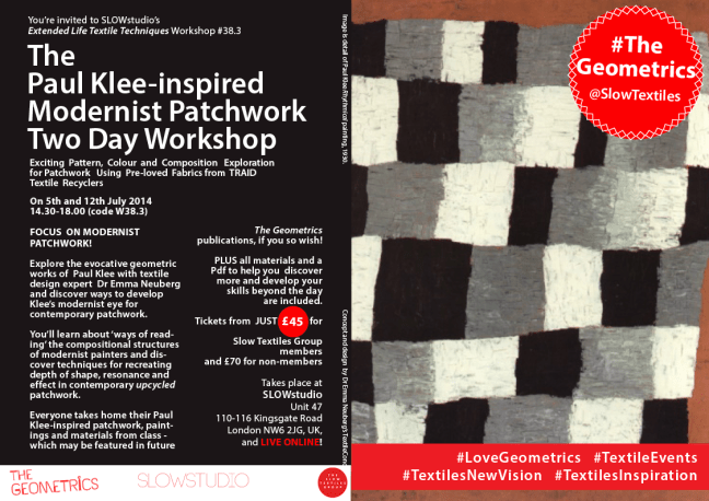 Online Attendance Tickets are available for your convenience from just £45 (Slow Textiles Group Members’ price). We use Google+ Hangout which is easy to use (all you need is a Google+ account). Alternatively, come to the London studio to gain the full experience of an exciting professional textile design studio, personal tutoring, group experience and learning, Slow Textiles handouts and realia, new work made with professional materials, embodied knowledge, networking, a glass of wine, refreshments and lots of fun from just £85 (Slow Textiles Group Members’ price)!