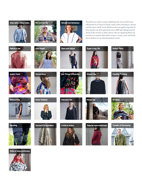 Garments are used in many satisfying and resourceful ways influenced by a fusion of body, mind, habit, technique, stories and the piece itself. Local Wisdom has been gathering tales of how people use their garments since 2009 and taking portrait shots of the owners in their pieces. We are applying these use practices to inspire alternative ways to create, wear and think about fashion in an interdependent world.