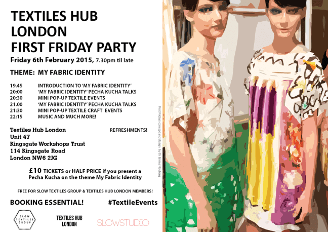 Slow Textiles Group: My Fabric Identity First Friday Party at Textiles Hub London, 6th Feb 2015 from 7.30pm – join in! Posted on January 16, 2015 by Emma Neuberg On Friday, February 6th 2015, from 7.30pm til late at Textiles Hub London: Share this: Click to share on Facebook (Opens in new window) Facebook Click to share on X (Opens in new window) X Like Loading... Related
