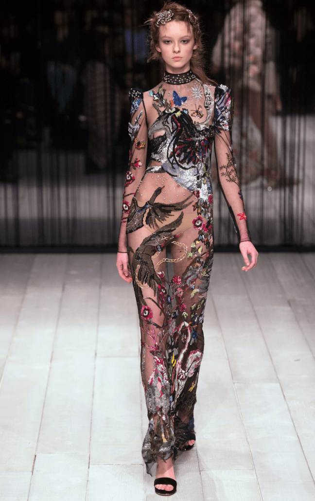 In yesterday’s show, 21st Feb 2016 in London, we were presented with a mix of evening party glamour, moonlit boudoir and punk constraint. Less evident was the exciting and irreverent mood that we came to expect from Lee McQueen with his take-your-breath-away collections. Instead, beneath the embroidered threads and sequins is a melancholic space that reminds us of the pre-Raphaelites’ world (1848 – 1920). May be this is no wonder in view of Lee’s legacy. The bigger picture suggests that fashion, so often construed as fleeting, can really be seen as a reflection of the on-going cultural symbols of its time and geographic and cultural location.