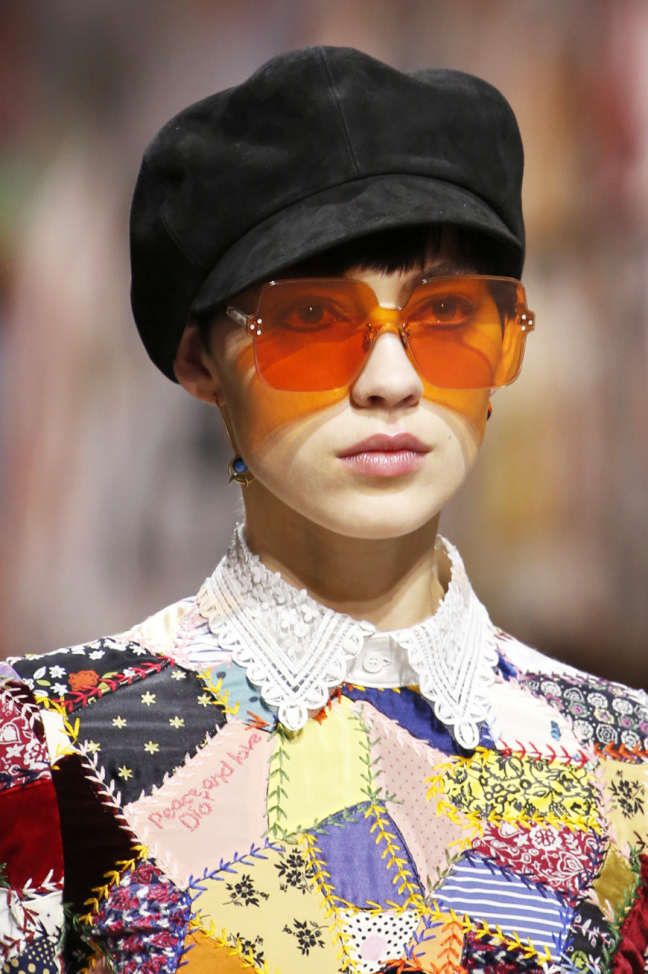 The mix ‘n’ match patchwork theme that we saw at Tsumori Chisato continues apace at Christian Dior Fall 2018. The detail is finer and there’s stitch added to hold it all together and embroidered text too to get key Peace and Love messages across.