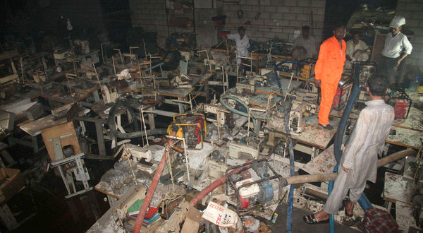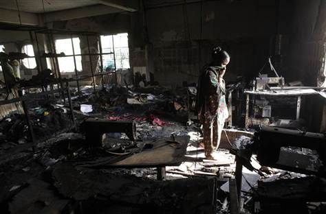 A textiles worker returns to the sewing room at Tazreen Fashions, Bangladesh. Further information and details here.